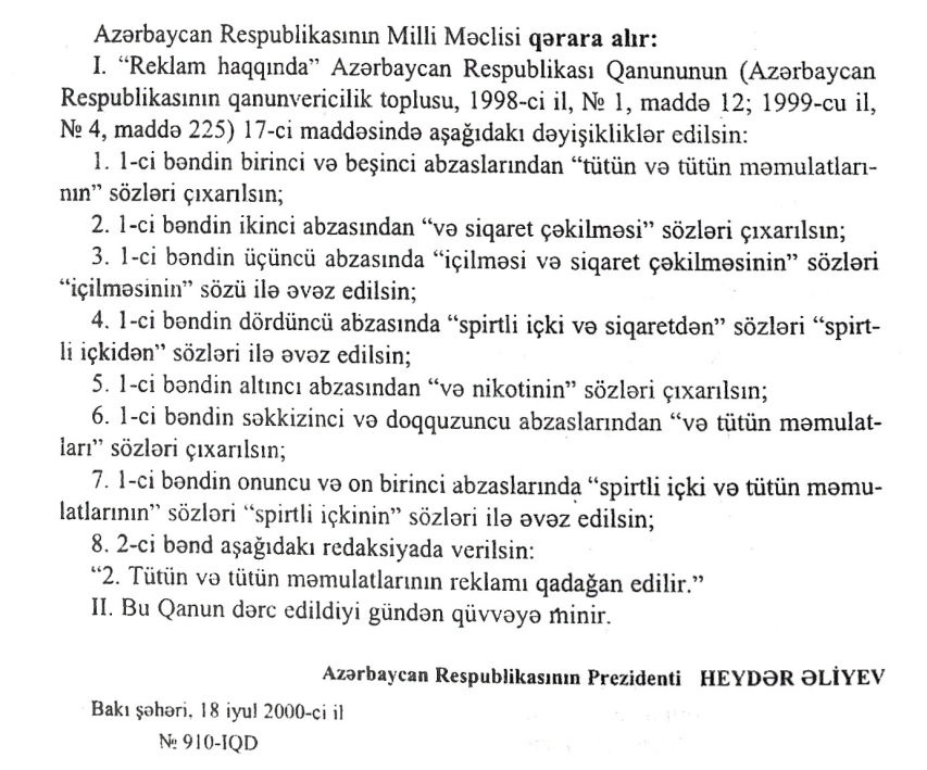 "Reklam haqqında" Azərbaycan Respublikasının Qanununda dəyişiliklər edilməsi barədə