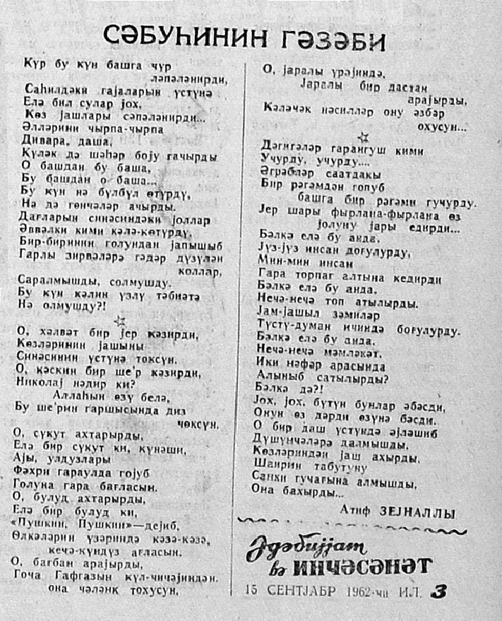 Zeynallı A. Səbuhinin qəzəbi /Şer.- Ədəbiyyat və incəsənət, 1962, 15 sentyabr. |