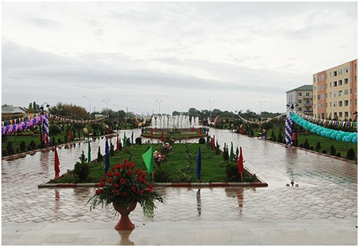 Dekorativ ağaclar, gül kolları əkilmiş parkdakı müasir fəvvarələr buraya xüsusi yaraşıq verir.