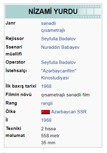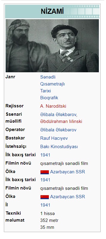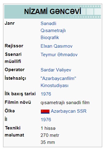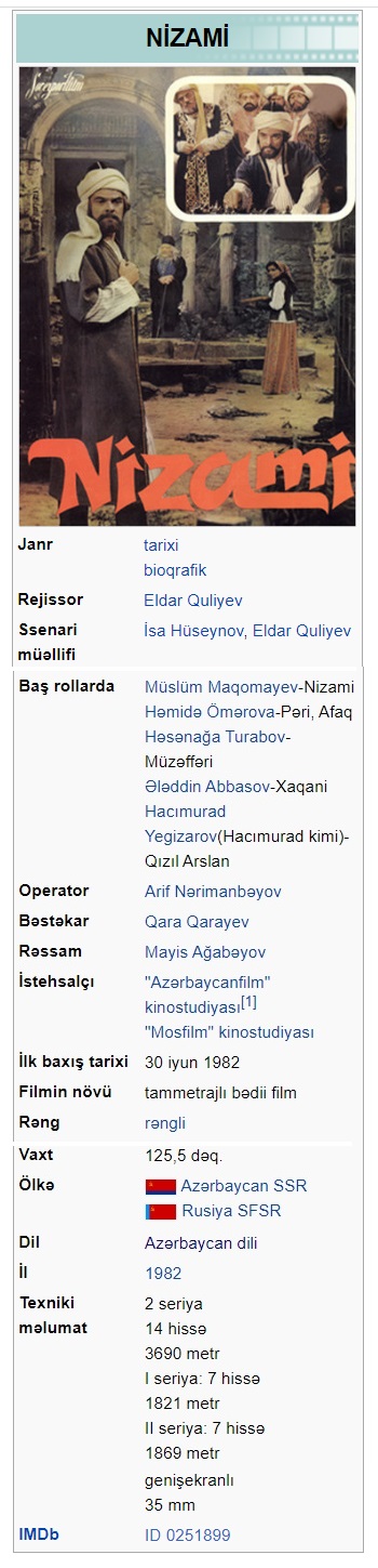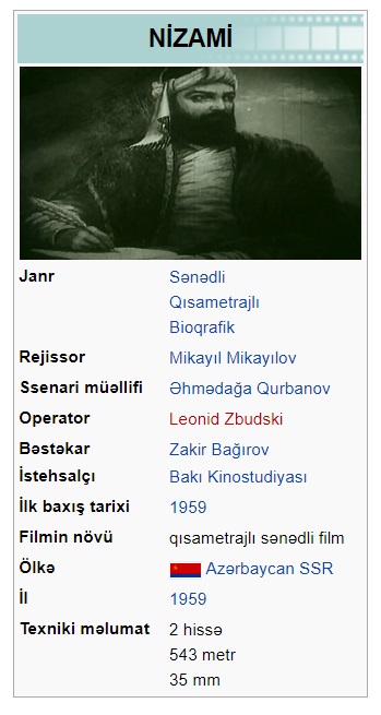 Nizami (film, 1941) Nizami (film, 1959) Nizami yurdu (film, 1968) Nizami Gəncəvi (film, 1976) Nizami Gəncəvi (film, 1982)