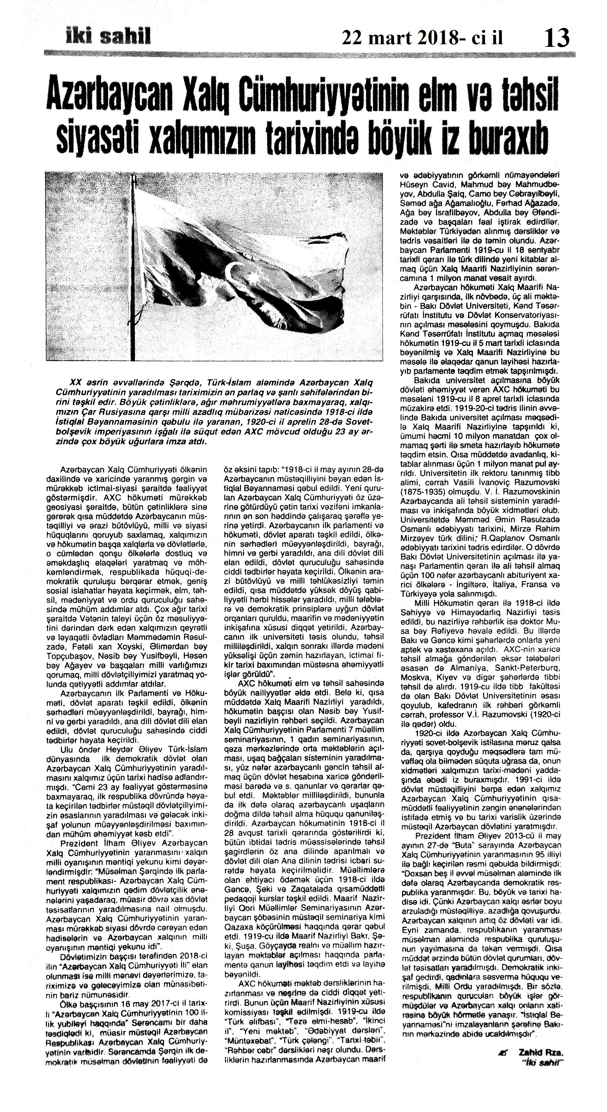 Azərbaycan Xalq Cumhuriyyəti və təhsil [Mətn] /İ.Verdiyev //Üç nöqtə 2018.-