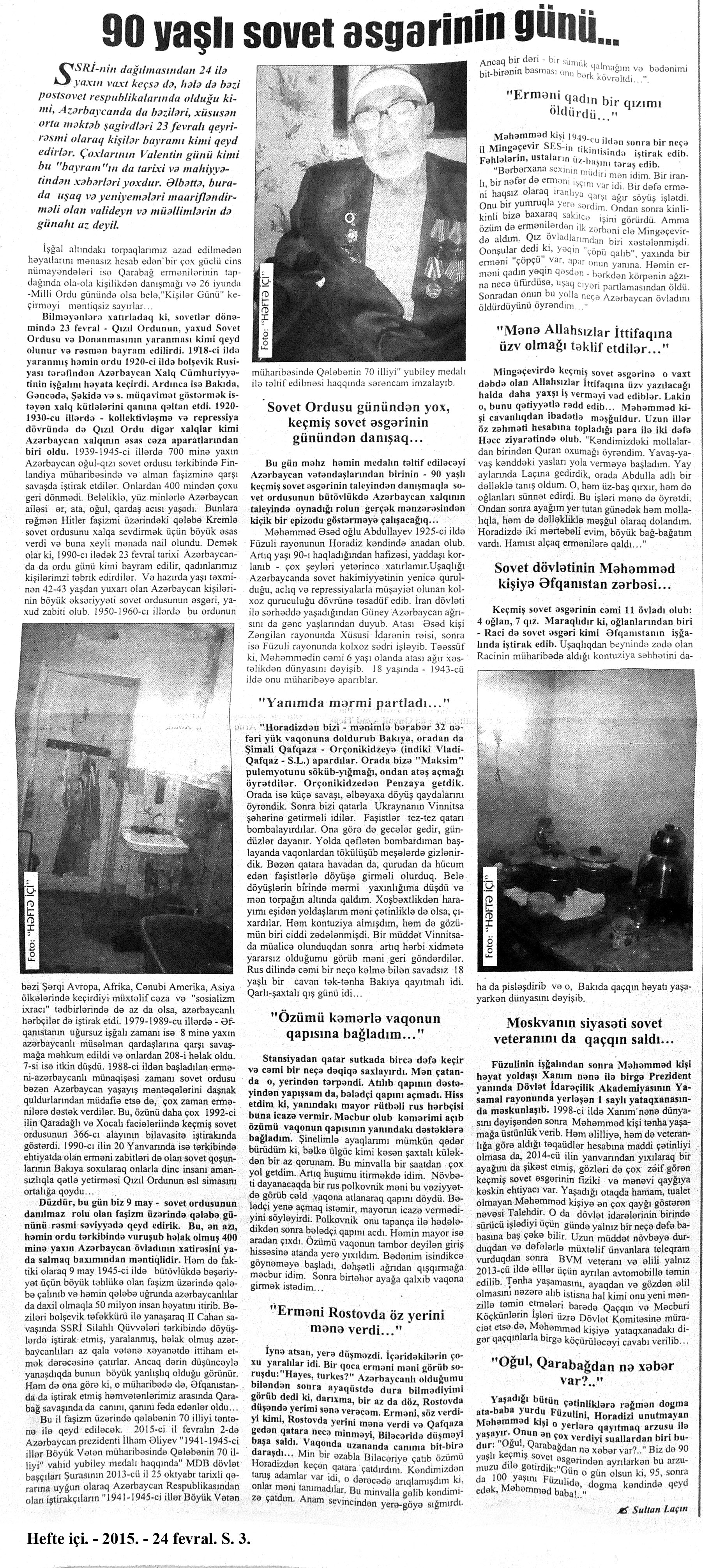 Laçın, Sultan. 90 yaşlı sovet əsgərinin günü... [Mətn] /S. Laçın //Həftə içi 2015.- 24 fevral.- S.3. Böyük Vətən Müharibəsi iştirakçısı Məhəmməd Abdullayev haqqında
