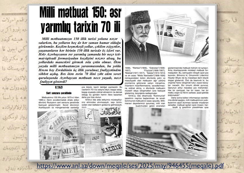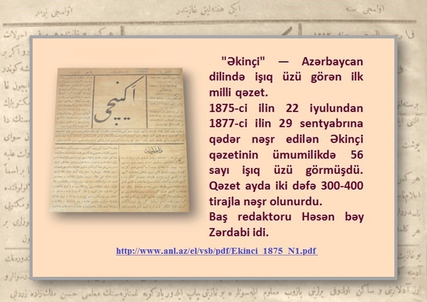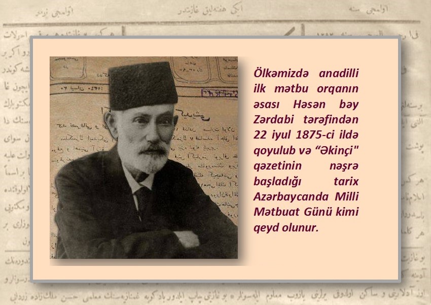 XIX əsrin ikinci yarısında dünyanın neft və sənaye mərkəzlərindən birinə çevrilmiş və iqtisadi yüksəliş dövrünü yaşayan Azərbaycanın ictimai-siyasi və mədəni həyatında əsaslı dəyişikliklər baş vermiş, maarifçilik hərəkatı genişlənməyə başlamış, milli mətbuatın yaranması zərurəti meydana çıxmışdı. Məhz buna görə də 150 il əvvəl - 1875-ci il iyulun 22-də görkəmli ziyalı, təbiətşünas alim və maarifçi-publisist Həsən bəy Zərdabinin Azərbaycan dilində nəşr etdirdiyi "Əkinçi" qəzeti milli mətbuatımızın ilk nümunəsi və ölkəmizin həyatında mühüm hadisə kimi tarixə düşmüşdür. Cəmi iki il fəaliyyət göstərən qəzet maarifçi ideyaların carçısı olmuş, cəhalətə və xurafata qarşı kəskin məqalələr dərc etmiş, milli özünüdərkin, ictimai, siyasi və bədii fikrin inkişafına, mütərəqqi jurnalist nəslinin yetişməsinə önəmli töhfə vermişdir.