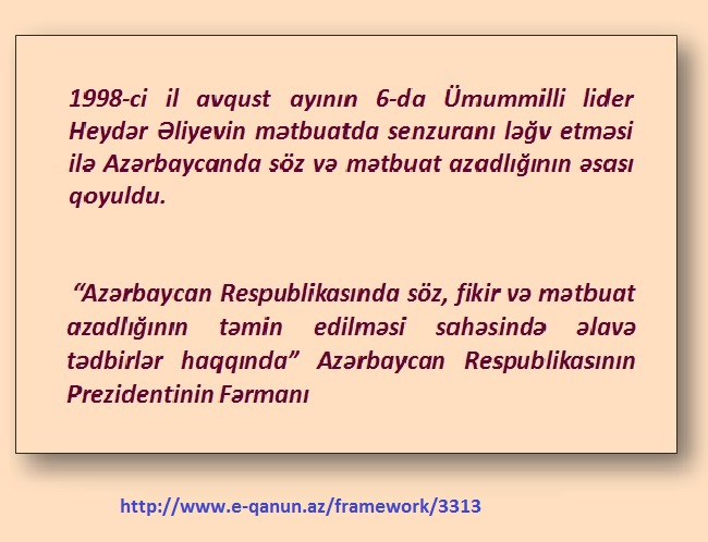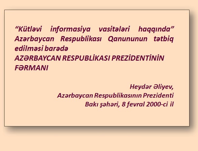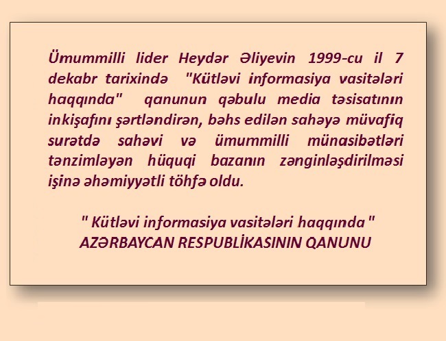 Keçən yüzilliyin sonlarında xalqın tələbi ilə yenidən hakimiyyətə qayıdan Ümummilli Lider Heydər Əliyevin rəhbərliyi ilə həyata keçirilən islahatlar ölkəmizdə söz və məlumat azadlığının, fikir plüralizminin və digər demokratik dəyərlərin bərqərar olması üçün etibarlı zəmin yaratdı. Heydər Əliyev medianın inkişafını prioritet vəzifələrdən biri hesab etmiş, onun fəaliyyətini tənzimləyən qanunvericilik bazasının formalaşdırılması, inkişafını əngəlləyən süni maneələrin aradan qaldırılması, maddi-texniki bazasının möhkəmləndirilməsi istiqamətində ardıcıl qərarlar qəbul etmiş, dövlət-media münasibətlərində mütərəqqi ənənələrin əsasını qoymuşdur.