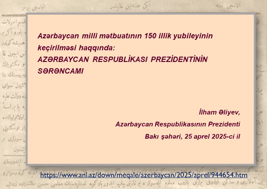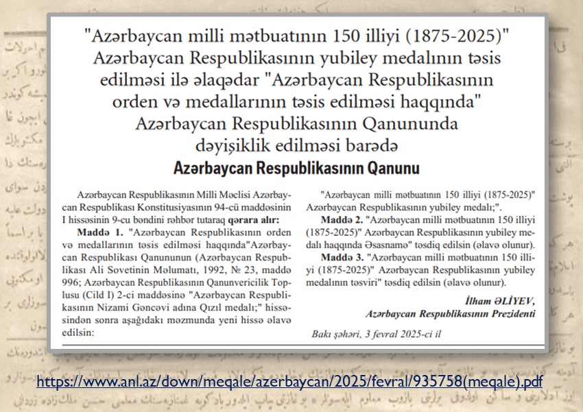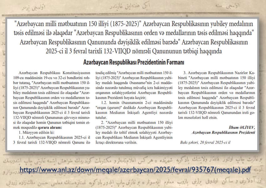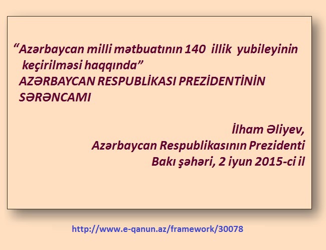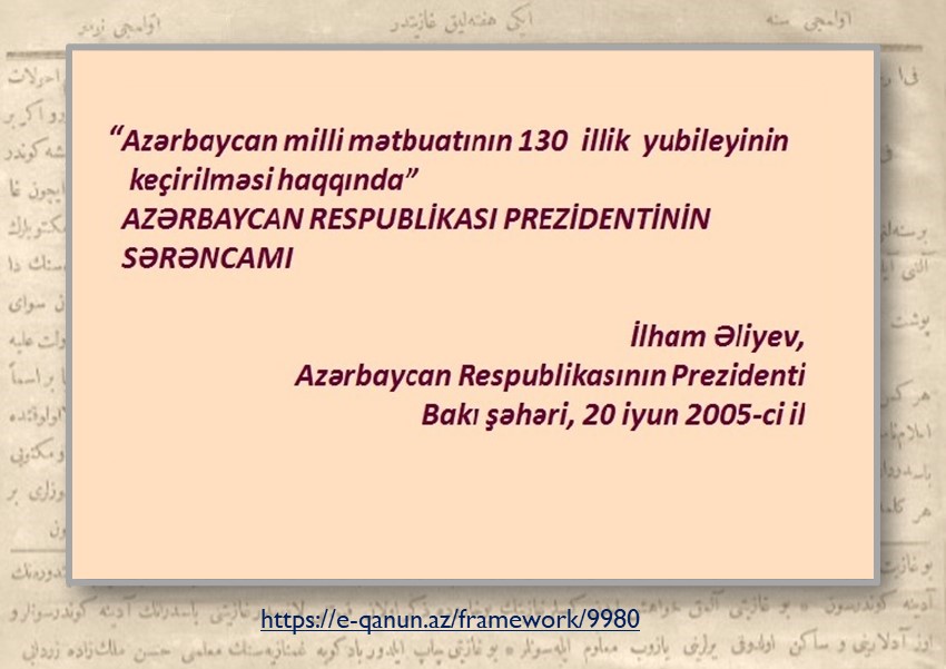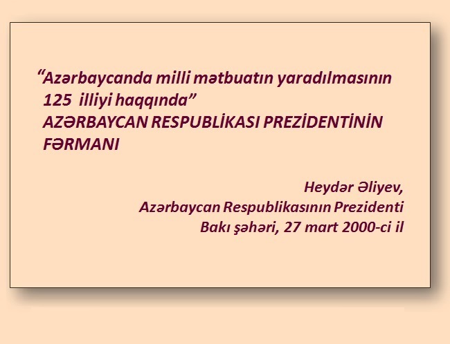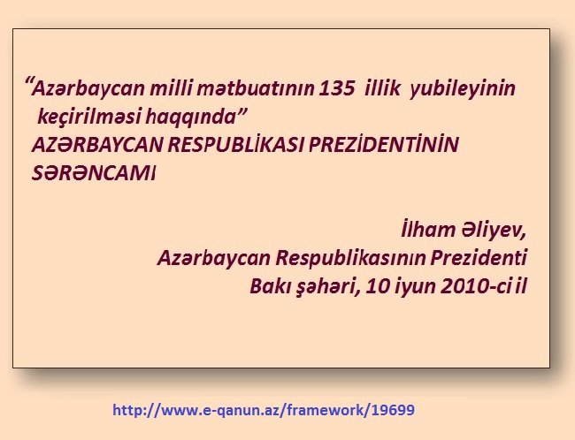Azərbaycan Respublikası Konstitusiyasının 109-cu maddəsinin 32-ci bəndini rəhbər tutaraq, milli mətbuatın Azərbaycanın ictimai-siyasi və mədəni həyatındakı yerini, mədəniyyətin, maarifçiliyin inkişafında rolunu, müasir cəmiyyət quruculuğu və ölkəmizin beynəlxalq nüfuzunun daha da yüksəldilməsi sahəsində töhfələrini nəzərə alaraq